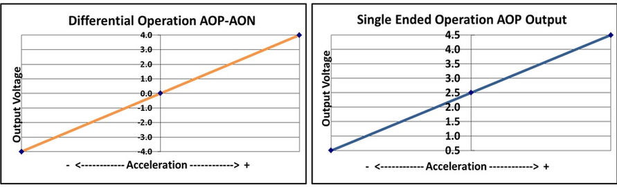 這兩款MEMS直流加速計——2012型和2422型,在以差分配置方式將AOP與AON輸出信號連接到檢測設備時能夠展現良好性能,同時它們也兼容單端操作,以便于實現最大的應用靈活性。加速計產生的模擬輸出電壓對(AON和AOP)隨加速度的變化而變化,其中心共模電壓約為2.5伏。在零加速度條件下,輸出差分電壓標稱值為0伏;而在達到±最大量程加速度時,輸出分別為±4伏。值得注意的是,輸出比例因子獨立于+5伏供電電壓。