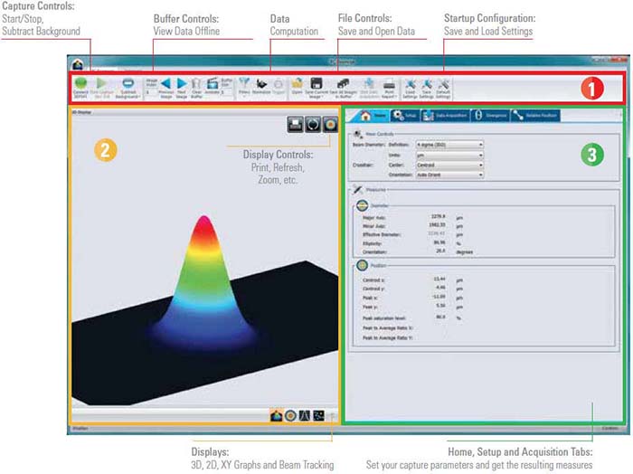 3 - 主頁和設置選項卡 —— 軟件右側包含主頁、設置和數(shù)據(jù)采集選項卡。主頁選項卡允許用戶選擇針對其測量的主要控制(光束直徑清晰度、瞄準器中心和定向),并在其下顯示測量結果。設置選項卡允許用戶設置測量參數(shù)(曝光時間、圖像定向和平均值、主動區(qū)等),數(shù)據(jù)采集選項卡允許用戶保存測量值或測量值及完整圖像,并輸入采集的采樣率和總持續(xù)時間。單擊計算面板中的顯示/隱藏選項按鈕,還可調(diào)出具有控制功能的更多選項卡。