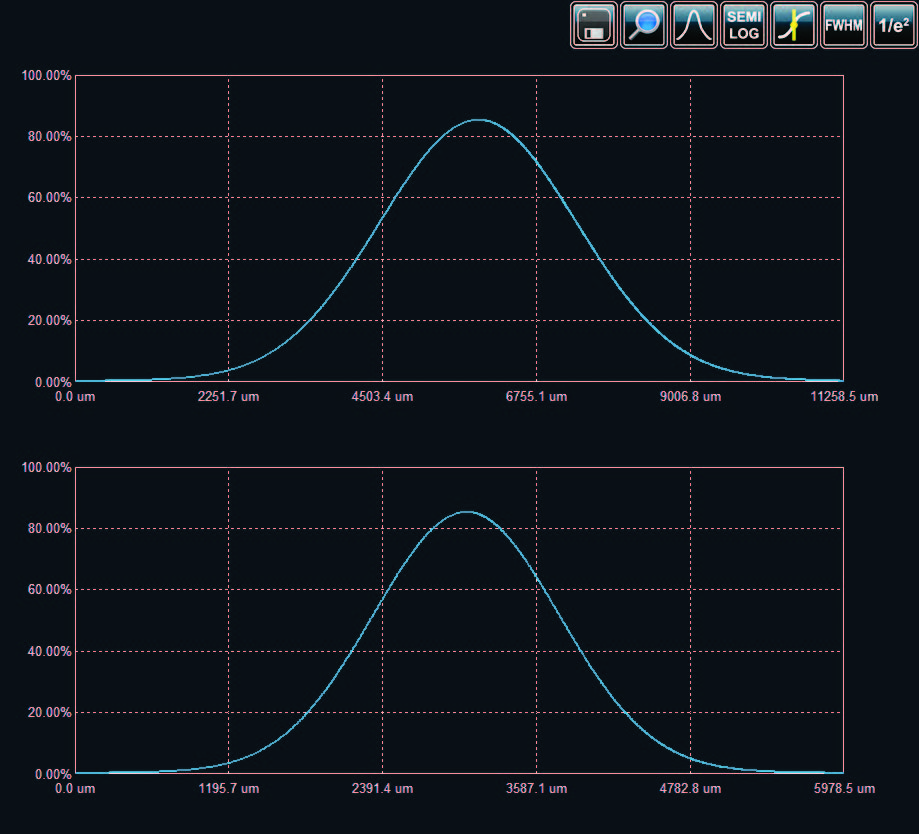 XY 顯示屏 —— XY 顯示屏繪制沿瞄準器的光束橫截面圖。其具有很多有用工具,包括縮放、光標、半峰全寬和 1/e2 級別條。另外還可以半對數(shù)格式顯示圖形,以增強光束低強度部分的細節(jié)。