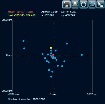 光束跟蹤顯示屏 —— 光束跟蹤顯示屏允許用戶對光束在傳感器上中心位置的變化進行可視化顯示。其可顯示最后計算位置和以前的位置,除非用戶重置視圖。另外還可顯示所有計算值的平均數(shù)位置,并提供有關 X 軸和 Y 軸位置穩(wěn)定性的信息。此工具非常適合于監(jiān)控光束隨時間變化的指向穩(wěn)定性。