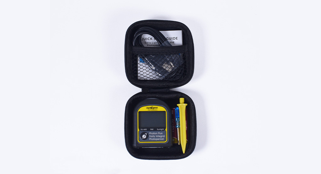堅固耐用且隨時可用:DLI-400 堅固耐用,防護 等級為 IP65,可承受惡劣和潮濕的環境,可以隨身攜帶進行抽查,直接放置在任何水平表面上,或通過連接到常用的相機三腳架、夾具或使用底部的標準 ?-20 螺紋端口進行樁子。DLI 儀表由鑄造丙烯酸擴散器(過濾器)、光學過濾器、光電二極管、信號處理電路和安裝在 ASA 塑料外殼中的 LCD 顯示屏組成。每個 DLI 包裝都包括儀表、一個保護性手提箱、兩節 AAA 電池、一個快速入門說明指南、一把螺絲刀、一個便于安裝的土壤釘和一根 USB-C 電纜,用于將儀表存儲的數據作為 CSV 文件下載到計算機。
