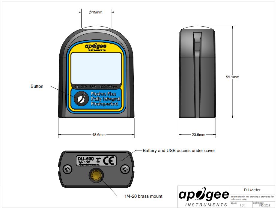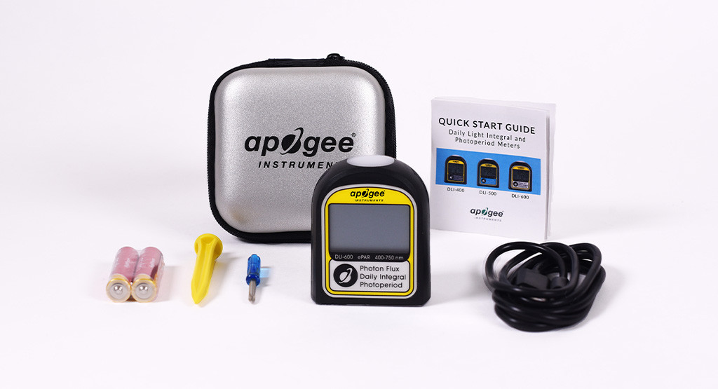 堅固耐用且隨時可用: DLI-600 堅固耐用,防護 等級為 IP65,可承受惡劣和潮濕的環境,可以隨身攜帶進行抽查,直接放置在任何水平表面上,或通過連接到常用的相機三腳架、夾具或使用底部的標準 ?-20 螺紋端口進行樁定。DLI 儀表由鑄造丙烯酸擴散器(過濾器)、光學過濾器、光電二極管、信號處理電路和安裝在 ASA 塑料外殼中的 LCD 顯示屏組成。每個 DLI 包裝都包括儀表、一個保護性手提箱、兩節 AAA 電池、一個快速入門說明指南、一把螺絲刀、一個便于安裝的土壤釘和一根 USB-C 電纜,用于將儀表存儲的數據作為 CSV 文件下載到計算機。