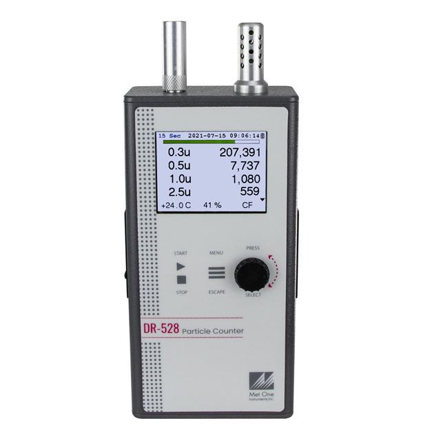 MET ONE INSTRUMENTS, INC. 手持式粒子計數器系列的新成員:DR-528。這款粒子計數器在功能和易用性方面進行了優化,配備 2.8 英寸 TFT 全彩 LCD 顯示屏,使準確的測量讀數和操作比以往任何時候都更加輕松。