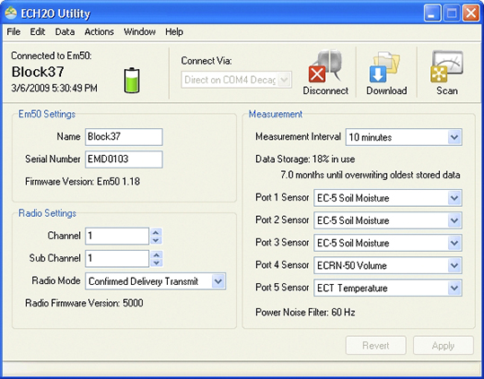 Em50是5通道數(shù)據(jù)采集器,是ECH2O土壤含水量監(jiān)測系統(tǒng)的核心部件,可與任意型號的ECH2O系統(tǒng)傳感器連接。將傳感器插入5個通道的任一接口就可以直接使用,操作十分簡便。Em50安裝在O型圈密封防雨的防護箱內(nèi),是野外長期監(jiān)測的理想選擇。電池型Em50的耗電量非常小,每分鐘讀取1個數(shù)據(jù),電池可連續(xù)使用1年。利用ECH2O Utility軟件可以設置日期、時間、測量間隔和數(shù)據(jù)收集等。