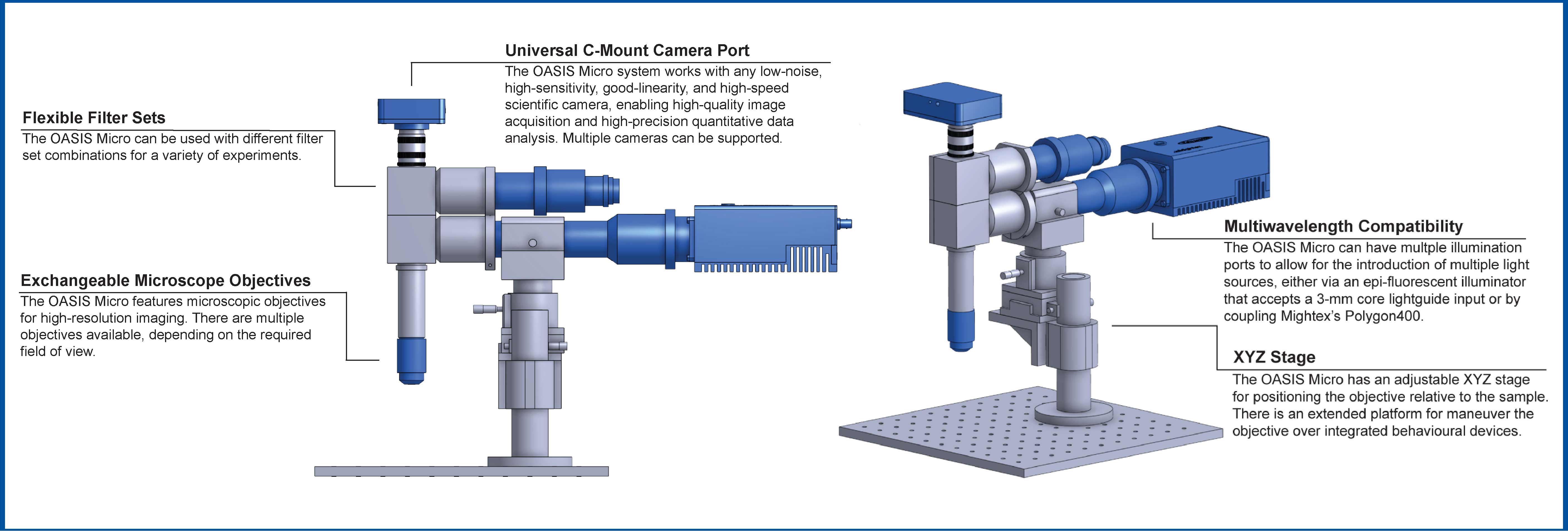 OASIS Micro 專為體內實驗而設計,采用極簡主義設計。重型精密XYZ載物臺安裝在支撐結構上,OASIS光學組件又安裝在XYZ載物臺上。