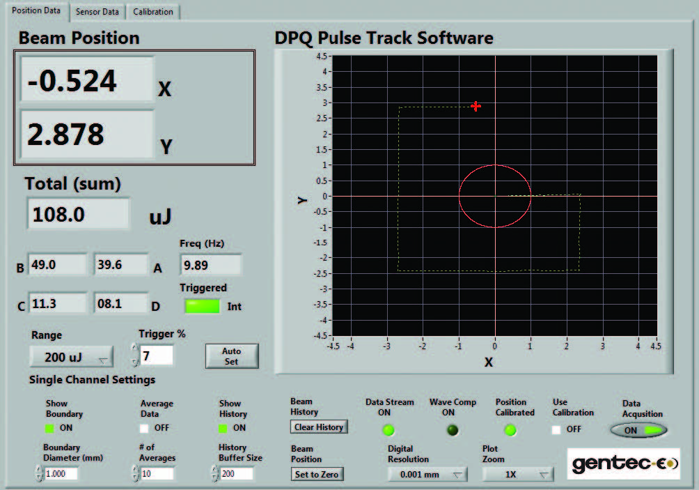 QUAD-4Track 包含功能強大的單機軟件 LabView,用于控制儀表、處理數(shù)據(jù)并顯示 X 軸和 Y 軸位置。該軟件還可顯示脈沖源的能量或功率以及重復率。本界面中的大型圖表顯示線束的矩心位置并實時追蹤其移動。該關鍵包含許多實用功能,例如:設置邊界、放大(2 倍至 128 倍)、設置分辨率、數(shù)據(jù)記錄等,不一而足。綠線代表追蹤歷史。