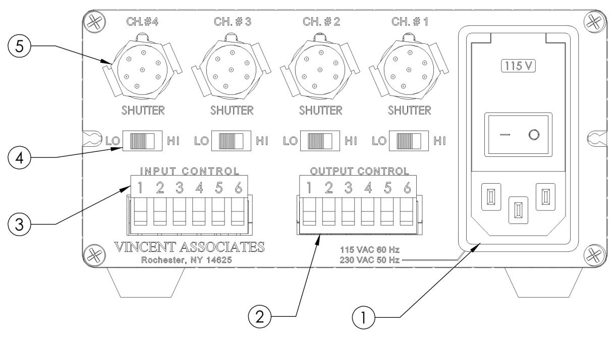 | 輸入控制 (3) | 為每個(gè)通道提供高電平有效控制。輸入 TTL 高 – 快門(mén)打開(kāi),輸入 TTL 低 – 快門(mén)關(guān)閉。端子 #5 – 有效高,輸入 TTL 高 – 所有快門(mén)打開(kāi),輸入 TTL 低 – 所有快門(mén)關(guān)閉。請(qǐng)參閱 VMM-D3/D4 用戶手冊(cè)第 15-19 頁(yè)中的端子排布局。 |