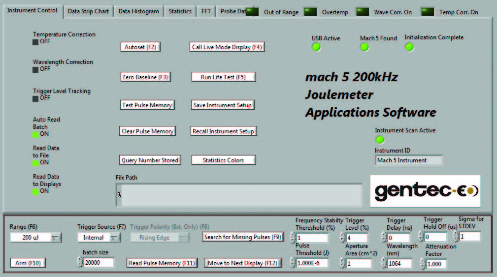 強(qiáng)大的 LabView 應(yīng)用軟件包括許多的控制和診斷功能。左邊所示的儀表控制屏幕用于設(shè)置 MACH 6 的運(yùn)行,包括量程、觸發(fā)、波長和其他項(xiàng)目。此外,還可通過該界面設(shè)置脈沖批大小并配置儀表,從而啟動(dòng)數(shù)據(jù)采集。您可以通過該控制屏幕訪問“自動(dòng)設(shè)置”、“調(diào)用實(shí)時(shí)模式”、“運(yùn)行壽命測試”、“保存儀表設(shè)置”等功能。直接點(diǎn)擊或者按下相關(guān)的功能按鈕便可訪問這些功能。