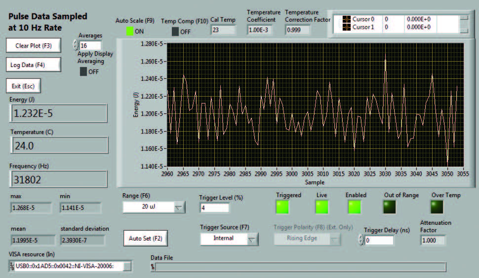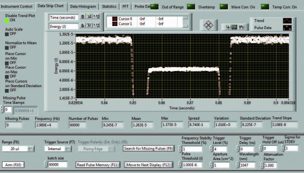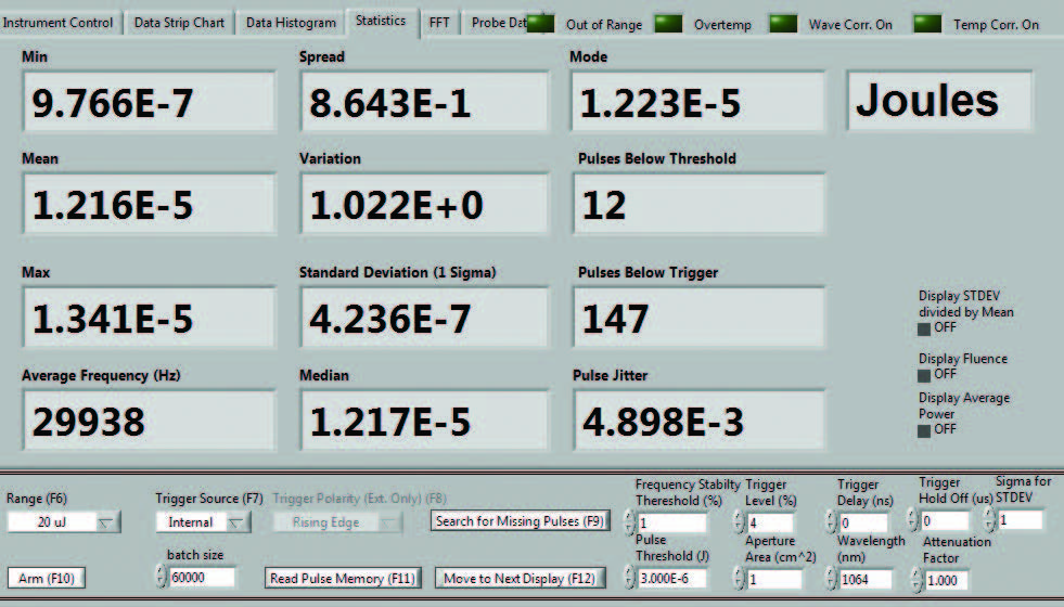 實(shí)時(shí)模式可從儀表控制屏幕訪問,您也可以簡單按下計(jì)算機(jī)上的“F4”功能鍵訪問該功能。在此模式下,由于需要在 10 Hz 頻率下采集激光脈沖樣本,儀表有意像普通慢速數(shù)字焦耳計(jì)一樣運(yùn)行。該模式為您提供能量帶狀圖、實(shí)時(shí)能量讀數(shù)、統(tǒng)計(jì)數(shù)據(jù)和重復(fù)率。在設(shè)置激光器的 Mach 6 時(shí),此模式非常有用。您可以選擇“自動(dòng)設(shè)置”,使用這一功能時(shí)儀表會(huì)跑遍各個(gè)量程和觸發(fā)電平,直至其找到正確的范圍;您也可以手動(dòng)進(jìn)行設(shè)置。設(shè)置完成后,您將退出該界面并返回到“控制”界面,然后在該界面選擇批的大小,配置儀表并開始采集脈沖能量數(shù)據(jù)。