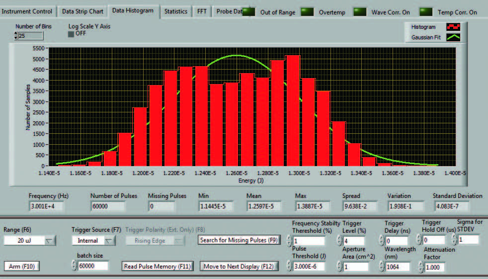 想查看脈沖能量數(shù)據(jù)組的統(tǒng)計(jì)分布嗎?直方圖界面可以幫您實(shí)現(xiàn)。直方圖將為數(shù)據(jù)擬合“高斯曲線”。直方圖會(huì)沿圖表底部顯示完整的統(tǒng)計(jì)計(jì)算連同脈沖頻率。在統(tǒng)計(jì)數(shù)據(jù)的下方,您可以看到量程和觸發(fā)等儀表控制鈕。您還可以根據(jù)需要調(diào)整觸發(fā)延遲和釋抑。