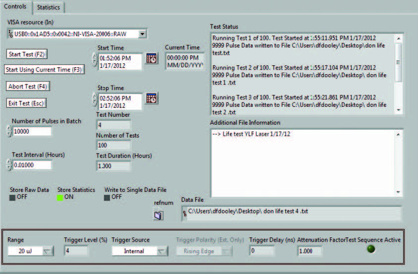 您是否希望對高重復(fù)頻率脈沖激光器開展壽命測試?是否想了解環(huán)境變化(例如溫度)對循環(huán)測試產(chǎn)生的影響?我們新增了一項(xiàng)強(qiáng)大功能,可助力您實(shí)現(xiàn)上述需求。在壽命測試界面中,您可自主選擇所需的統(tǒng)計(jì)指標(biāo),設(shè)定測試的起始日期與時(shí)間、結(jié)束日期與時(shí)間、脈沖數(shù)量以及測試間隔。您僅需指定一個(gè)用于存儲(chǔ)數(shù)據(jù)的文件,隨后點(diǎn)擊“開始”按鈕,之后便可放心離開、自由安排其他事務(wù)!待您返回時(shí),將看到一套完整的數(shù)據(jù)集,該數(shù)據(jù)集會(huì)按您選定的時(shí)間間隔,記錄激光器的性能表現(xiàn)、溫度變化、沖擊情況、振動(dòng)數(shù)據(jù),或您關(guān)注的任何其他參數(shù)。