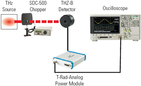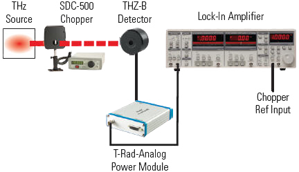 如果您需要測量信號可能淹沒在寬帶噪聲中的較低功率級別(即小于 5 μW),我們推薦使用此模擬設(shè)置選項。由 T-RAD-ANALOG 供電的模擬 THZ-B-DA 探測器電壓輸出連接至鎖定放大器輸入,SDC-500 斬波器的同步輸出則連接至參考輸入。鎖定放大器將鎖定斬波頻率,可通過撥入較長積分時間測量均方根很低的電壓。該電壓除以電壓響應(yīng)度 (V/W) 即等于輻射源的功率。