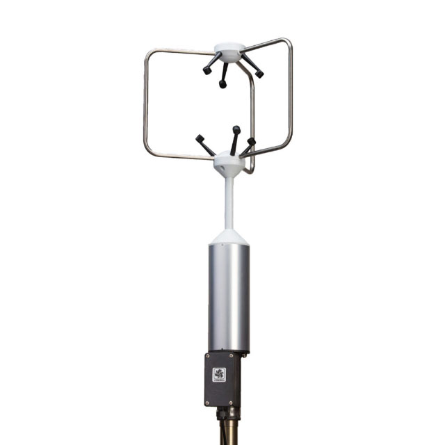 The YOUNG Model 81000 Ultrasonic Anemometer measures both horizontal and vertical wind speed and direction. This sensor features durable, corrosion-resistant construction with three opposing pairs of ultrasonic transducers supported by stainless steel members. An extended mast separates the transducer array from the instrument body to minimize wind disruption. Each sensor is fully wind tunnel tested and calibrated to provide accurate wind measurement. The standard sensor features RS-232 and RS-485 serial outputs. Wind and sonic temperature data are available on four analog voltage outputs. The sensor mounts on a standard 1-inch IPS pipe. A mounting orientation ring is included that engages with the base of the sensor to retain orientation when the sensor is removed for maintenance. Terminations are made in a junction box at the base of the sensor by small clamp-style connectors (no special connectors are required).