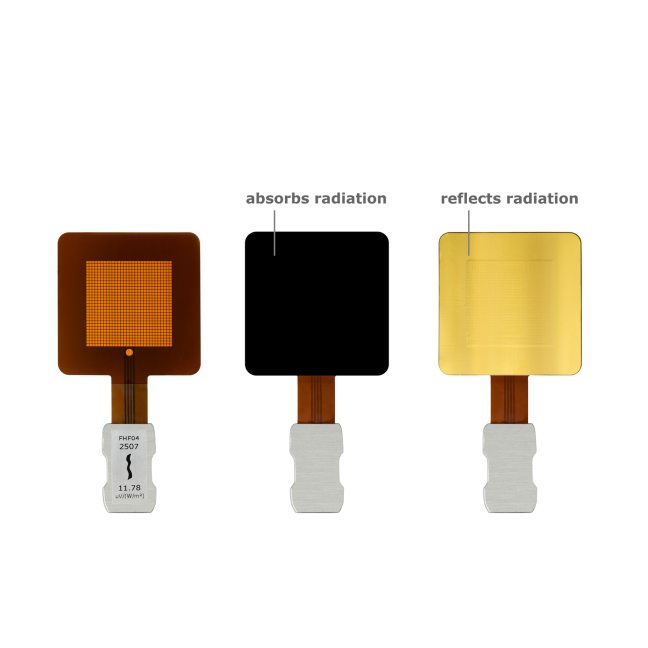 FHF04 is the latest standard model for general-purpose heat flux measurement. Significantly thinner and more flexible, FHF04 replaces earlier models FHF01 and FHF02. FHF04 is very versatile: it has an integrated temperature sensor and thermal spreaders to reduce thermal conductivity dependence. It is applicable over a temperature range from –70 to +120 °C. FHF04 measures heat flux from conduction, radiation and convection. Optionally, black BLK and gold GLD stickers are available to separately determine heat transport by radiation and convection.