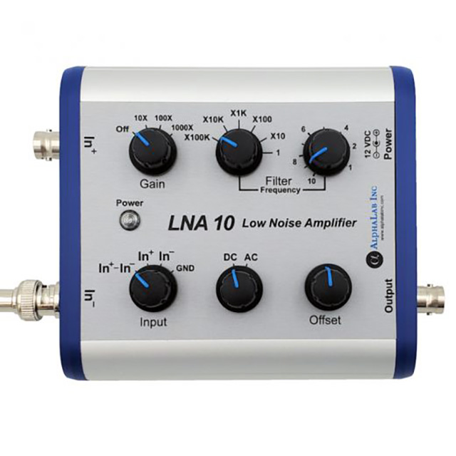 Selectable gains are 10x, 100x, 1000x (true differential, with CMRR > 90dB). Also positive and negative single-ended inputs can be selected, as well as reference ground. Gain accuracy: +/-1%. (The LNA 10 does not include a 1x gain.)