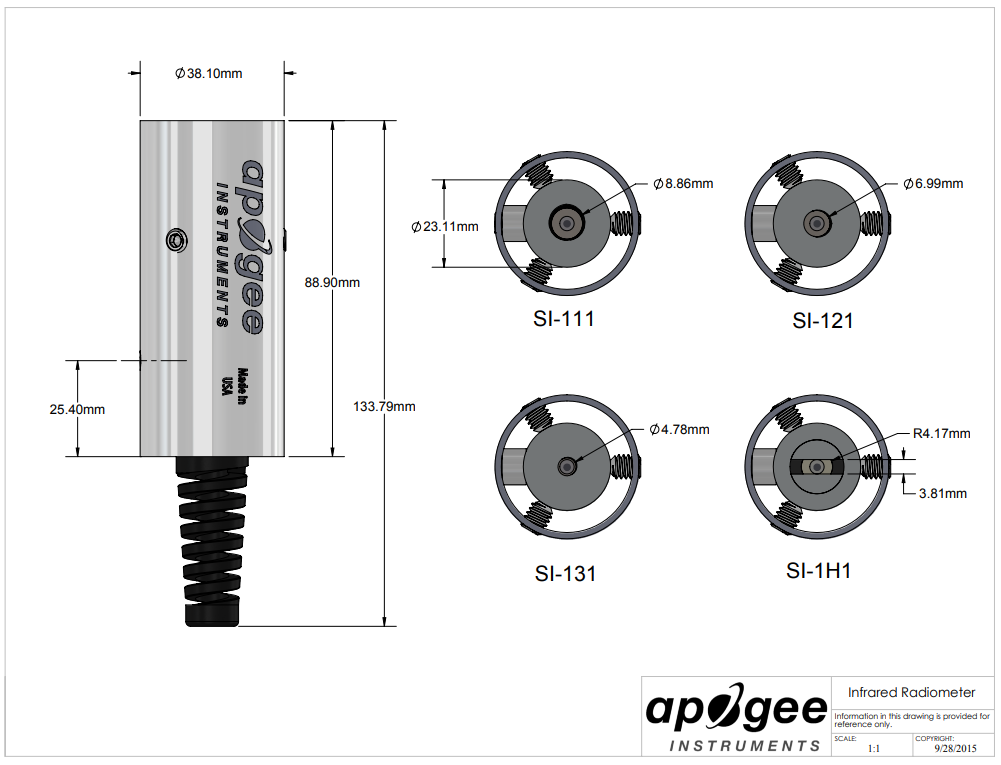 The MI-210 has a hand-held meter, attached via cable, that displays and stores sensor measurements. The sensor has a 22° half-angle field of view and a response time of 0.6 seconds. Typical applications include plant canopy temperature measurement for use in plant water status estimation, road surface temperature measurement of determination of icing conditions, and terrestrial surface (soil, vegetation, water, snow) temperature measurement in energy balance studies.