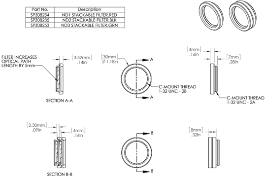 4mm spacing screw on filter for camera with transmission of between 20% and 5% depending on spectral range Can be stacked and combined with other filters and beam splitters.. One filter is included with Ophir cameras