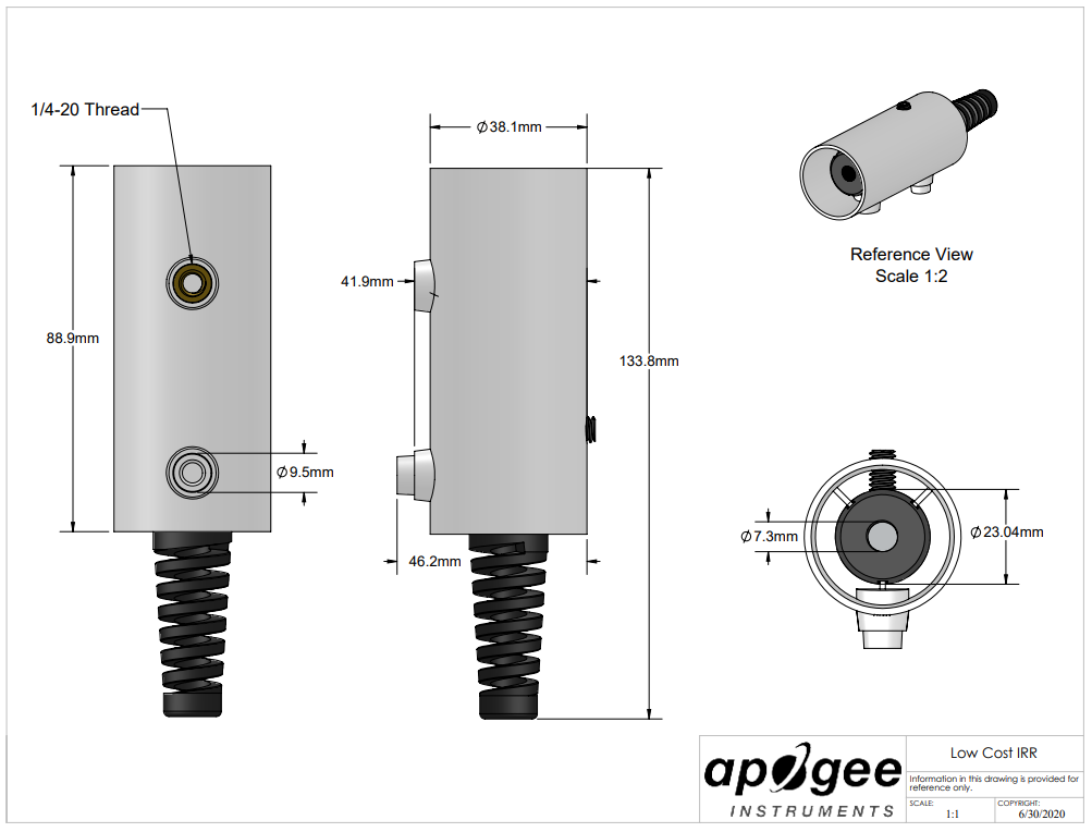 The SIL-411 has an SDI-12 digital output and 5 m high-quality cable terminating in pre-tinned pigtail leads for easy connection to dataloggers and controllers. The sensor has a 22° half-angle field of view and a response time of 0.6 seconds. Typical applications include plant canopy temperature measurement for use in plant water status estimation, road surface temperature measurement of determination of icing conditions, and terrestrial surface (soil, vegetation, water, snow) temperature measurement in energy balance studies.